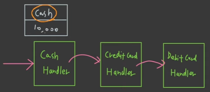 첫번째로 CashHandler를 만납니다. (요청을 처리할 수 없어서 다음 Handler를 호출합니다)