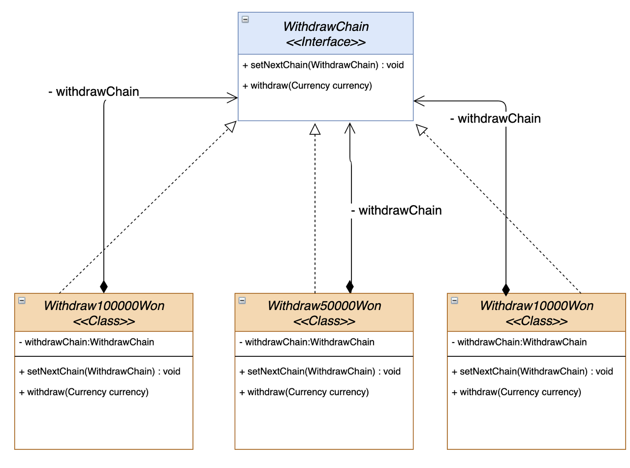 public interface WithdrawChain { void setNextChain(WithdrawChain withdrawChain); void withdraw(Currency currency); }인터페이스는 다음 처리를 지정해주는 setNextChain()과 요청을 처리할 withdraw 메서드로 구성됩니다.