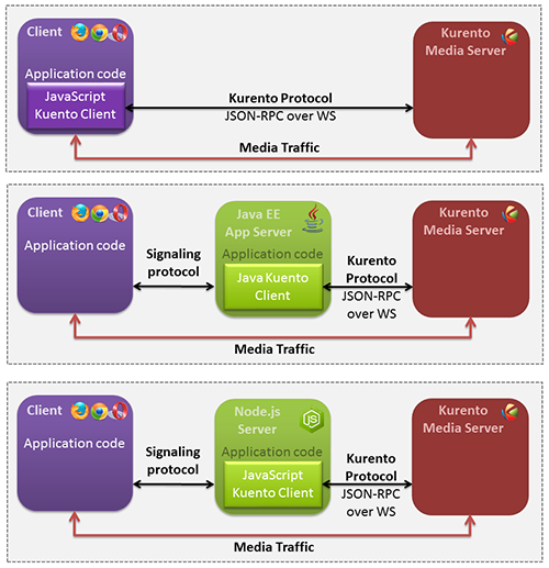 Kurento Protocol이라고도 부르는 JSON-RPC 프로토콜을 통해 통신이 이루어지는데 3가지 시나리오가 있습니다.