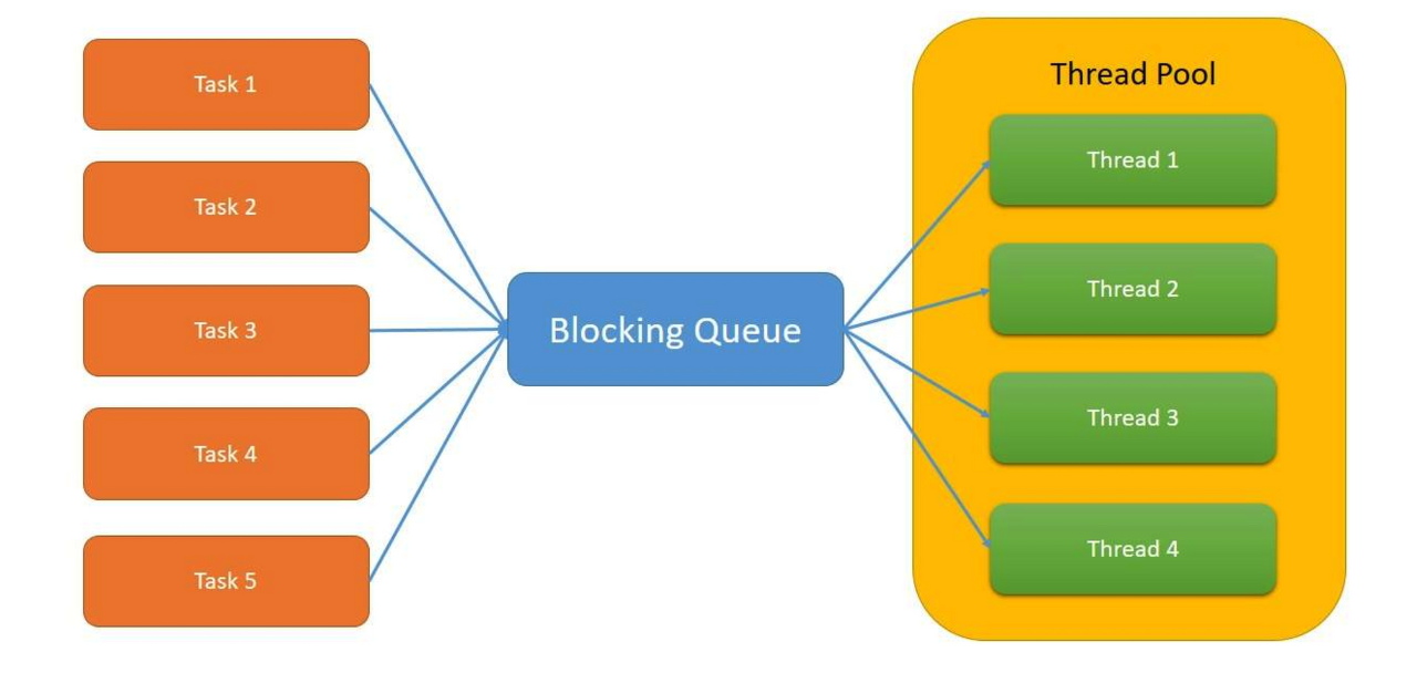 Task는 Queue로 관리되기 때문에 ThreadPool의 Thread 개수보다 실행할 Task가 많은 경우에 미 실행된 Task는 큐에 저장되어 실행을 마친 Thread가 생길 때까지 기다립니다.