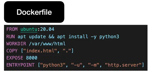 FROM ubuntu:20.04 RUN apt update && apt install -y python3 WORKDIR /var/www/html COPY ["index.html", "."] CMD ["python3", "-m", "http.server"]각 줄의 의미는 다음과 같습니다