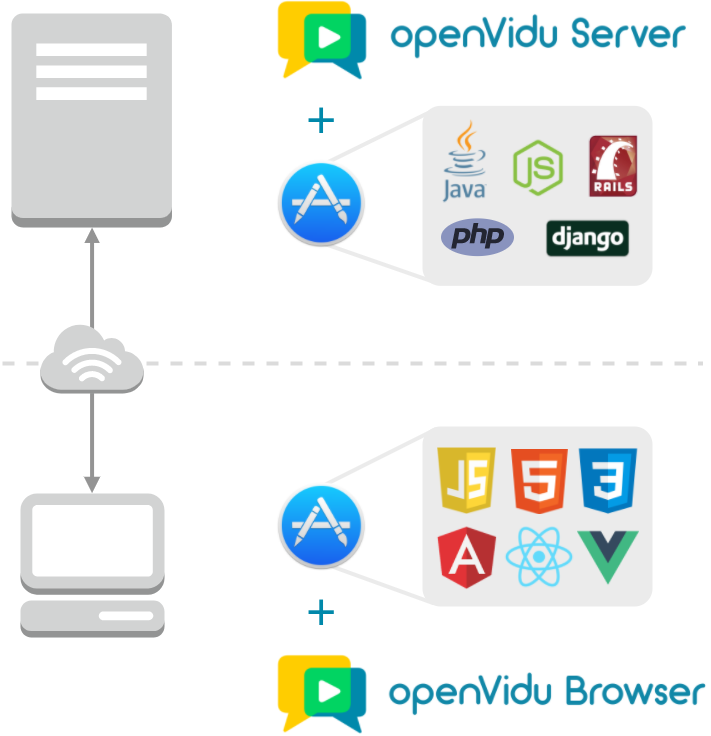 OpenVidu는 클라이언트 측 라이브러리를 포함하고 미디어 흐름을 처리하기 위해 OpenVidu Server를 사용하면 완전한 기능을 갖춘 WebRTC 지원 애플리케이션을 갖게 됩니다.