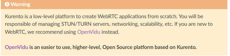 쿠렌토의 공식문서에서도 Warning이라는 메시지로 OpenVidu가 더 추상화되고 사용하기 쉽다고 명시되어 있습니다.