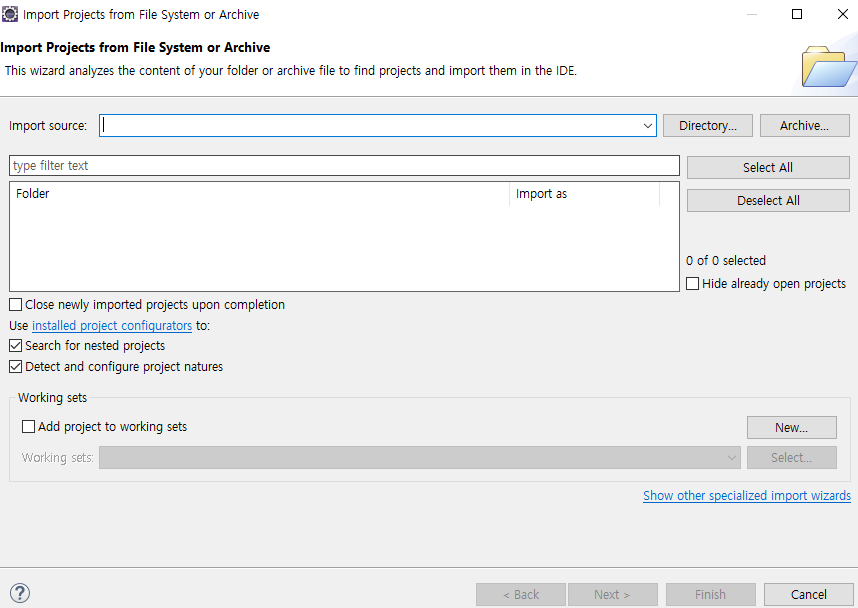 이클립스 좌측 상단에서 File -> Open Projects from File System을 클릭하면 아래와 같은 창이 나타납니다.
