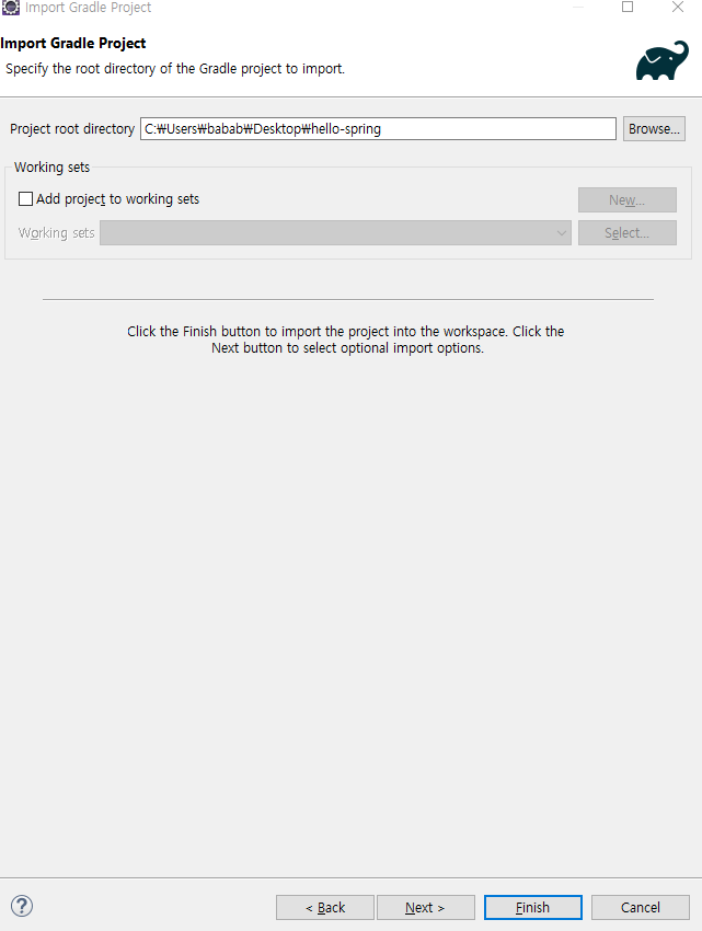 Directory 버튼을 클릭하여 다운로드하였던 hello-spring 폴더를 선택하고 Finish 버튼을 클릭합니다.