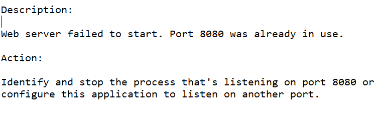 Port 8080 was already in use 에러와 원인과 해결 방법 메시지 *************************** APPLICATION FAILED TO START *************************** Description: Web server failed to start. Port 8080 was..