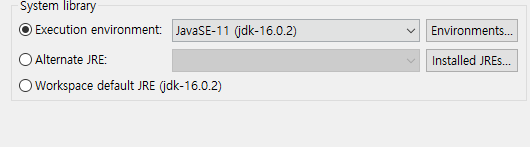 하지만 JRE System Library 우클릭 -> Properties -> Executio nenvironment 를 Java 11버전으로 설정해주어도 동일한 오류가 발생합니다.