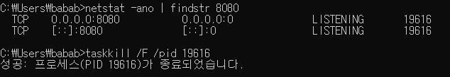 저는 Window를 사용하고 있으니 CMD창으로 가서 netstat -ano | findstr 8080 명령어로 현재 8080 포트를 사용하는 네트워크 정보를 출력하고 위의 정보로 process_id를 알아낸뒤 강제로 종료시킵니다.