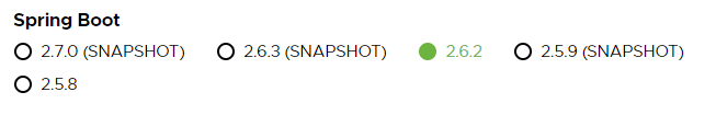 Spring Boot 버전 SNAPSHOT이란 아직 만들고 있는 버전을 의미하기 때문에 정식으로 배포된 2.6.2를 선택하겠습니다.