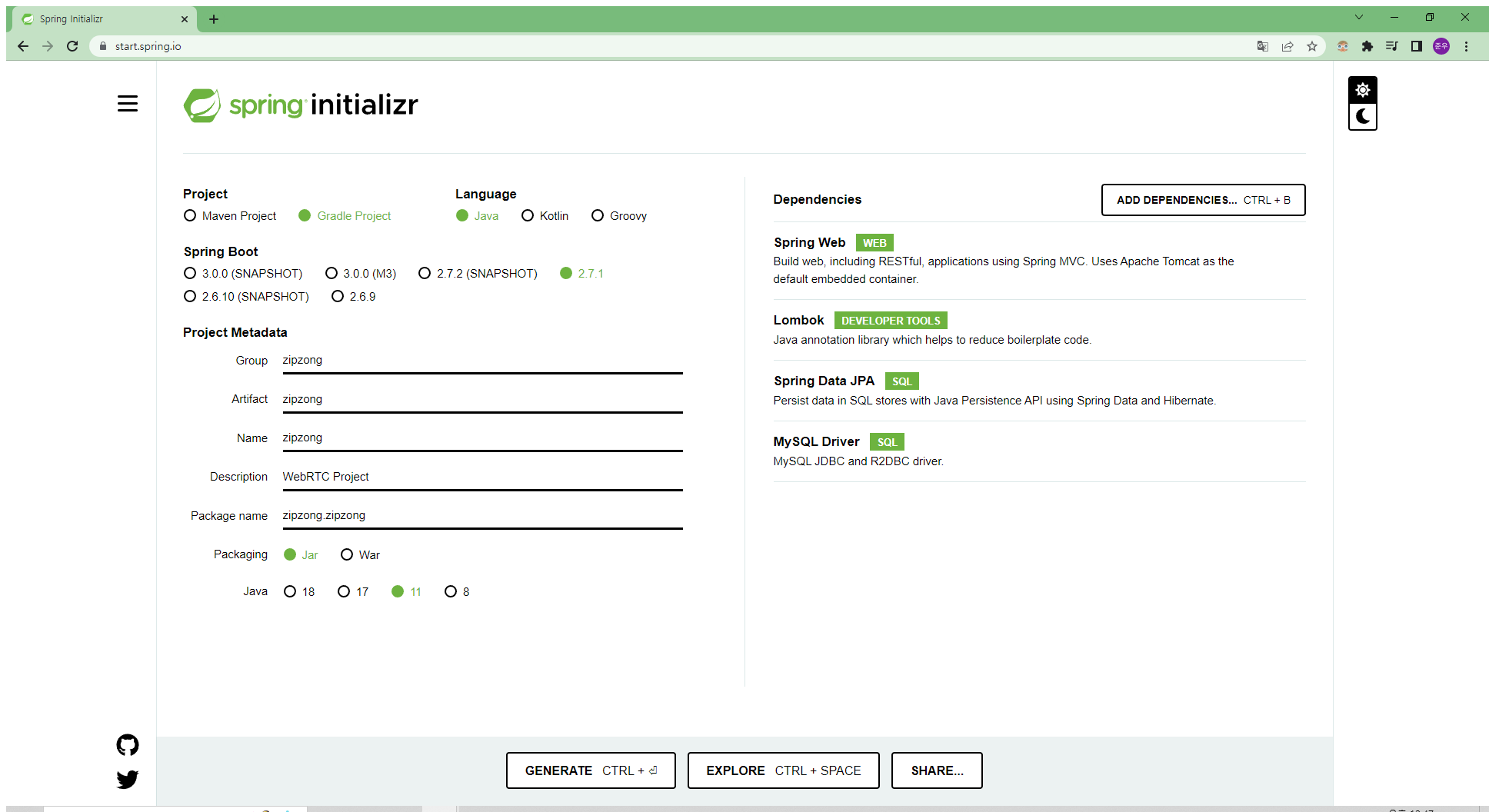 plugins { id 'org.springframework.boot' version '2.7.1' id 'io.spring.dependency-management' version '1.0.11.RELEASE' id 'java' } group = 'zipzong' version = '0.0.1-SNAPSHOT' sourceCompatibility = '11' configurations { compileOnly { extendsFrom annotationProcessor } } repositories { mavenCentral() } dependencies { implementation 'org.springframework.boot:spring-boot-starter-data-jpa' implementation 'org.springframework.boot:spring-boot-starter-web' compileOnly 'org.projectlombok:lombok' runtimeOnly 'mysql:mysql-connector-java' annotationProcessor 'org.projectlombok:lombok' testImplementation 'org.springframework.boot:spring-boot-starter-test' } tasks.named('test') { useJUnitPlatform() }java 11버전(sourceCompatibility = '11')