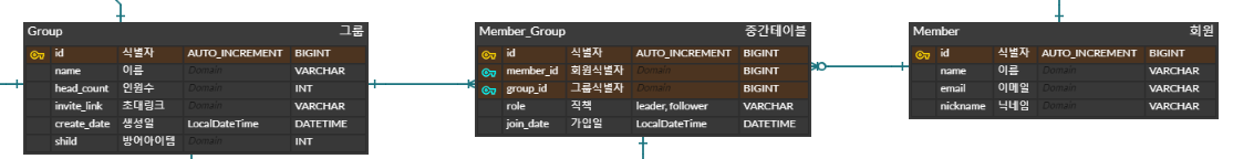 Member_Group이라는 중간 테이블을 두어 N:M을 1:N, N:1으로 풀어내고자 합니다.