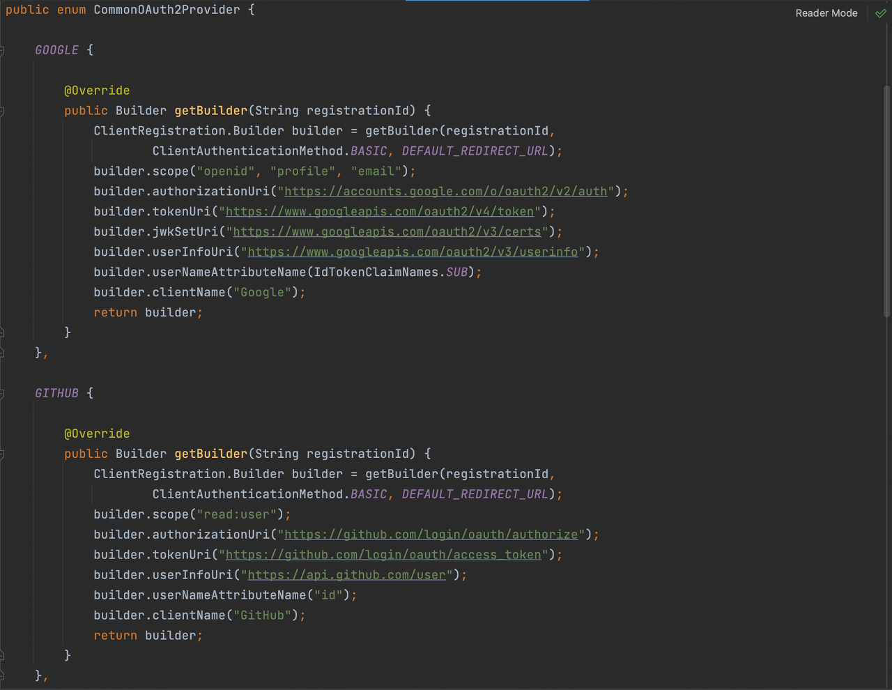 getCommonProvider 메서드 CommonOAuth2Provider는 자주 사용하는 OAuth2 server의 정보들을 미리 세팅해놓은 enum 클래스입니다.