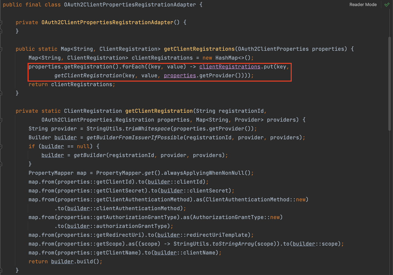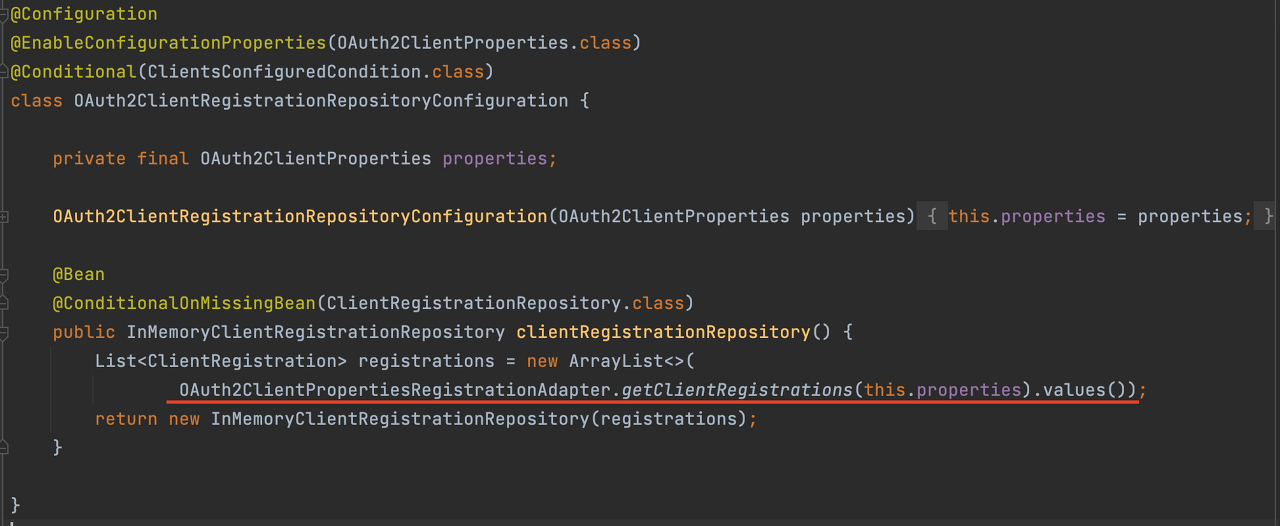 이 과정이 OAuth2PropertiesRegistrationAdapter에서 이루어집니다.