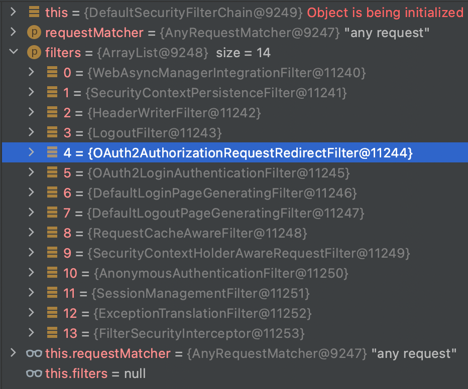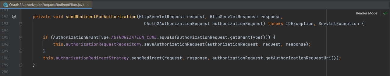 그 중 OAuth2AuthorizationRequestRedirectFilter 에서 /oauth2/authorization/{registrationId}로 온 요청을 처리합니다.