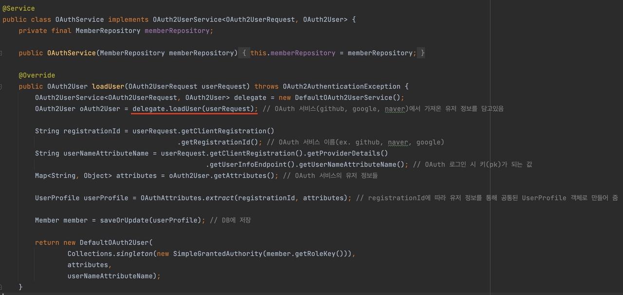 이때 delegate는 DefaultOAuth2UserService입니다.