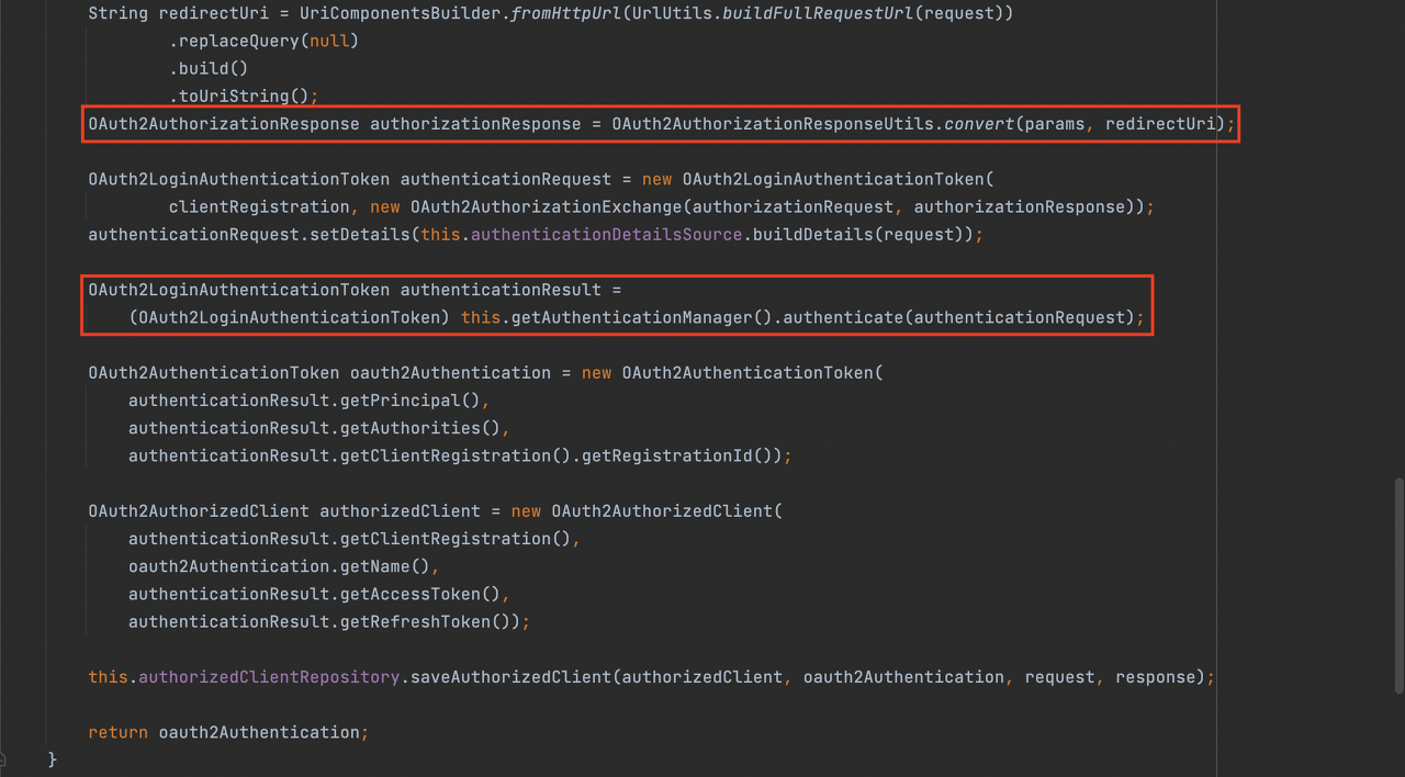 이후에 OAuth2 server의 access token을 얻기 위한 authoziation coed를 OAuth2AuthorizationResponse 객체로 만들고 이를 통해 access token을 가져옵니다.
