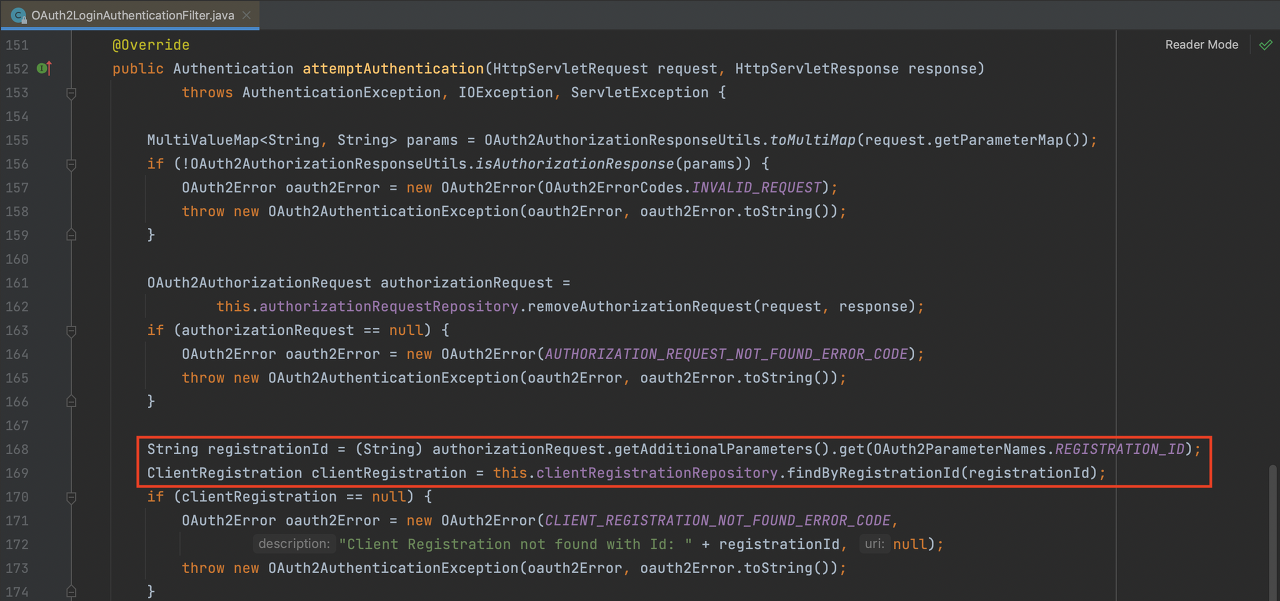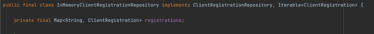 추출한 registrationId를 통해 InMemoryClientRegistrationRepository의 findByRegistrationID 메서드를 통해 설정에서 만들어진 ClientRegistration 객체를 가져옵니다.