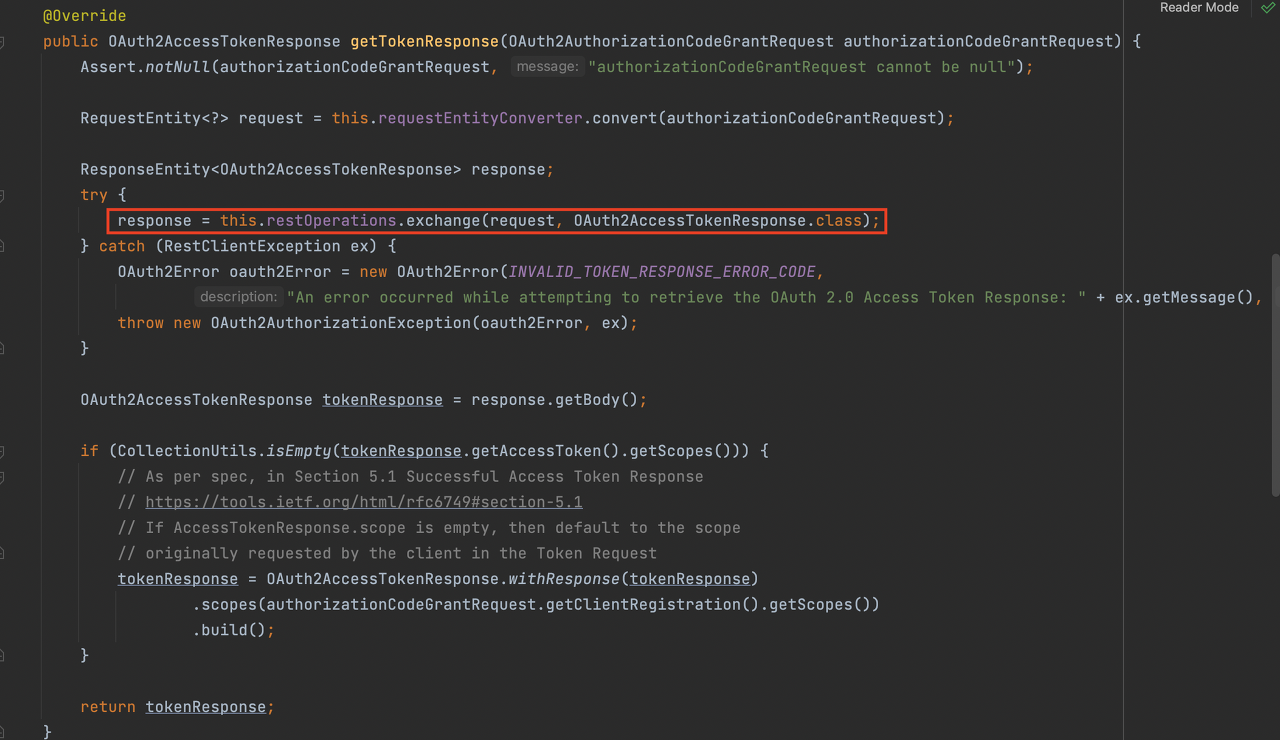 DefaultAuthorizationCodeTokenResponseClient의 getTokenResponse 메서드에서 RestTemplate를 이용해 OAuth2 Server로 access token request를 보냅니다.