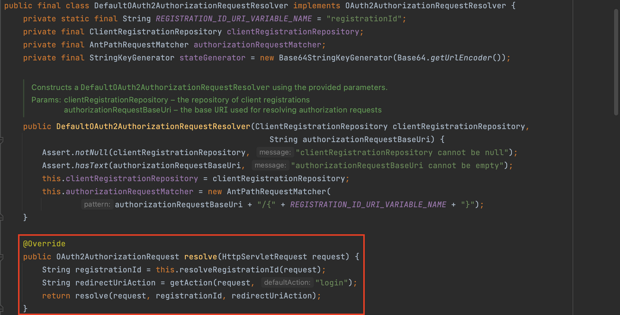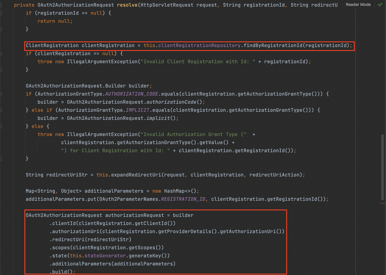 OAuth2AuthorizationRequestRedirectFilter는 OAuth2AuthozizationRequestResolver의 resolve 메서드를 호출합니다.