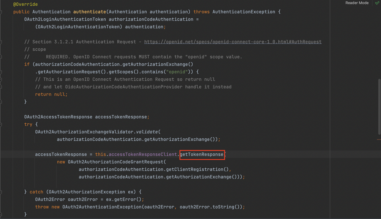 authenticate 메서드는 내부적으로 DefaultAuthorizationCodeTokenResponseClinet의 getTokenResponse 메서드를 호출합니다.