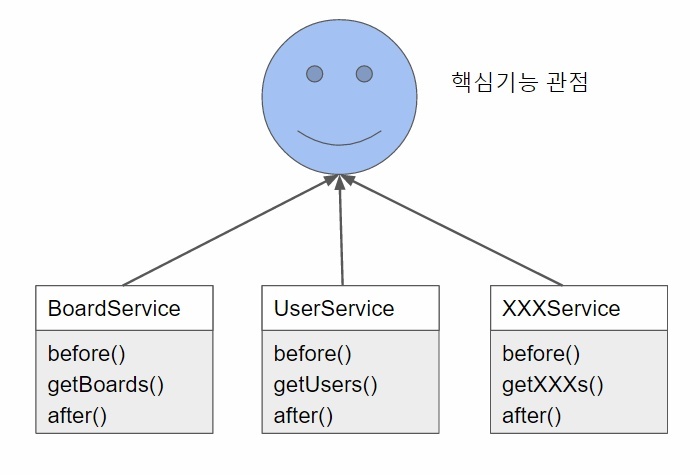 Proxy 패턴을 활용하여서 핵심로직(getBoards(), getUsers(), getXXXs())와 부가기능(before, after)을 분리할 수 있지만 이 또한 100개의 프락시 클래스를 생성하고 인터페이스 메서드를 일일이 구현해주어야 합니다.