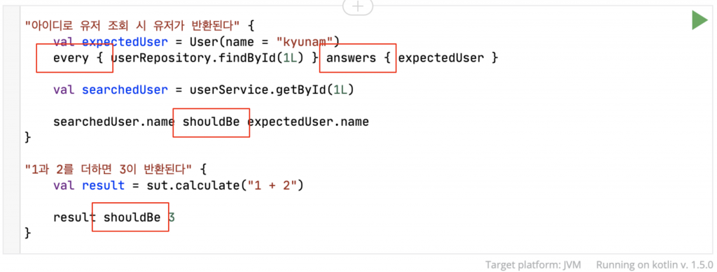 하지만 Kotest나 Mockk와 같은 도구를 사용하면 코틀린 스타일의 테스트 코드를 작성할 수 있습니다.