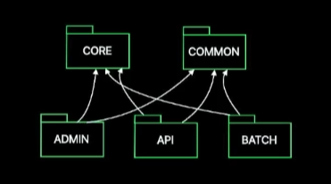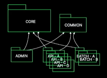 초기 프로젝트 ADMIN, API, BATCH 등의 서버가 존재하고 이들이 공통으로 참조하는 CORE와 COMMON 모듈이 존재합니다.