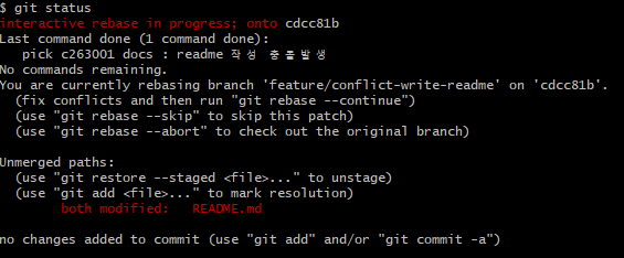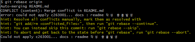 충돌이 났기 때문에 rebased를 할 수 없다고 합니다.
