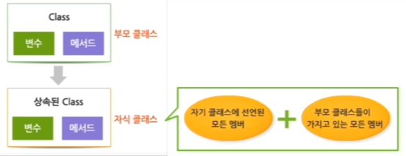 Java의 클래스는 변수와 메서드로 구성되기 때문에 상속이란 기본이 되는 클래스에서 변수와 메서드를 물려받고 여기에 자식 클래스에서만 가지는 추가적인 특징을 추가합니다.