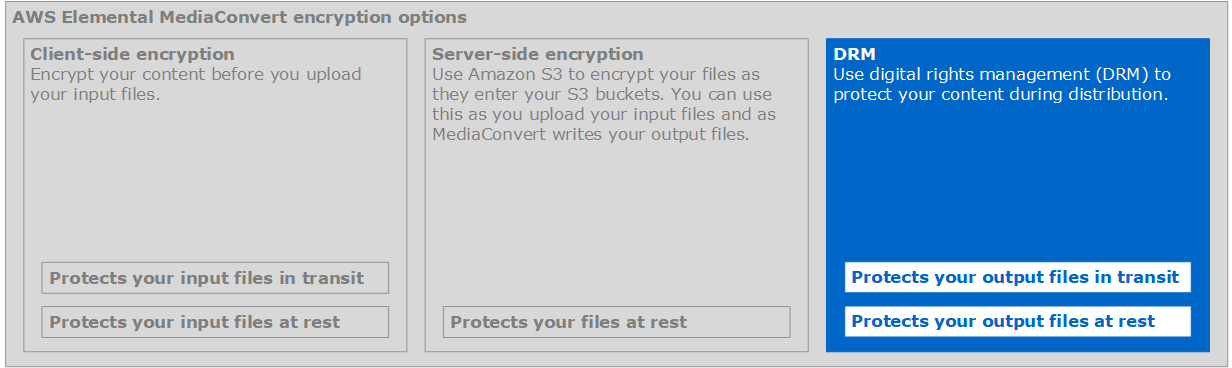 AWS Elemental과 함께 사용할 수 있는 세 가지 암호화 옵션 중 하나입니다. [그림 2 참고]