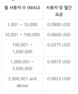 - 금액 : 400만 뷰 기준 약 100만 원 내외 예상 (MAU가 늘어날수록 저렴해짐) 300만 MAU부터는 동일하게 사용자 당 월간 0.0023 USD