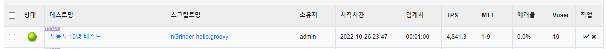 일단 가상 사용자를 10명으로 설정해보고 스크립트는 아까 지정한 nGrinder-hello.groovy를 불러옵니다.