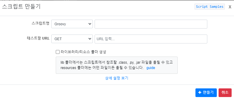 그림 7 이후 [그림 7]에 스크립트명과 http 메서드, url을 입력해줍니다.