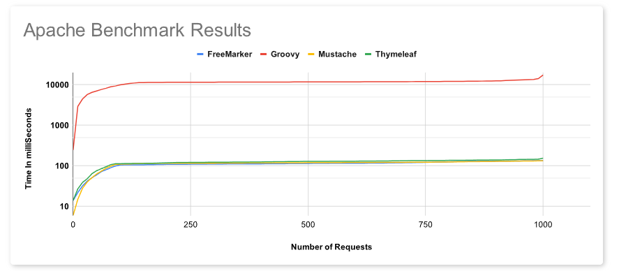 Mustache는 6초를 벗어나지 않으며 우수한 성능을 보여주며 최악은 Groovy이며 FreeMarker와 Thymeleaf는 비슷한 시간을 보여줍니다.