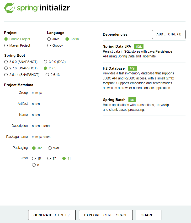 이번 시간에는 간단한 Spring Batch Job을 생성 & 실행하면서 전반적인 내용을 공부해보겠습니다. 작업한 모든 코드는 Github에 있으니 참고하시면 됩니다. 2-1. Spring Batch 프로젝트 생성하기 기본적인