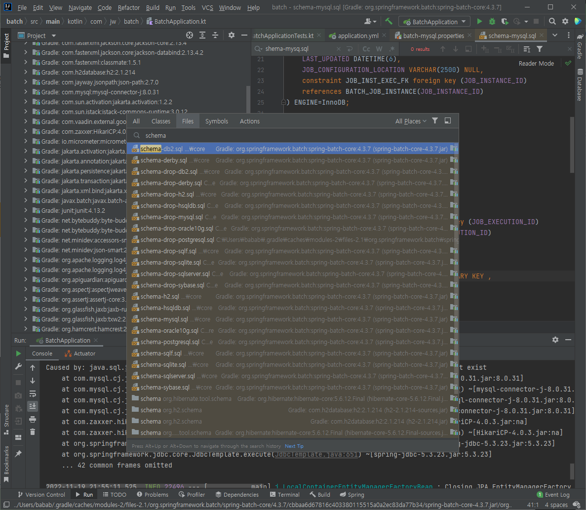 Caused by: java.sql.SQLSyntaxErrorException: Table 'spring_batch.batch_job_instance' doesn't exist메타 테이블 데이터인 BATCH_JOB_INSTANCE가 존재하지 않는다는 에러와 함께 배치가 실패했음을 알 수 있습니다.