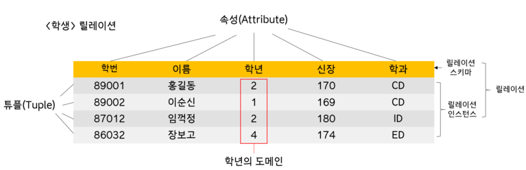 속성(Attribute) 학번, 이름, 학년, 신장, 학과 등은 하나의 열(Column)에 해당된다.
