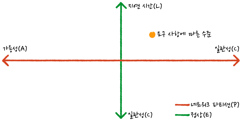 http://happinessoncode.com/2017/07/29/cap-theorem-and-pacelc-theorem/ 이때 지연 시간은 y축으로 올라갈 수록 지연시간이 짧아짐을 의미합니다.