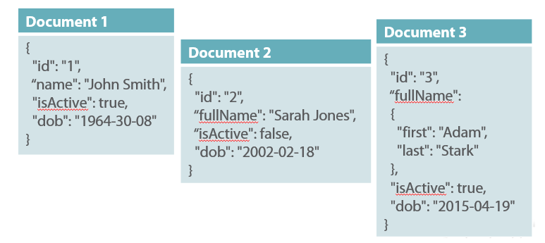 Document DB 예시 관계형 데이터베이스는 위와 같은 데이터를 저장하기 위해 first와 last 칼럼을 정의하고 null 값을 넣어야 하지만 문서 모델 NoSQL은 항상 고정된 필드를 가진 구조의 문서를 저장할 필요가 없습니다.