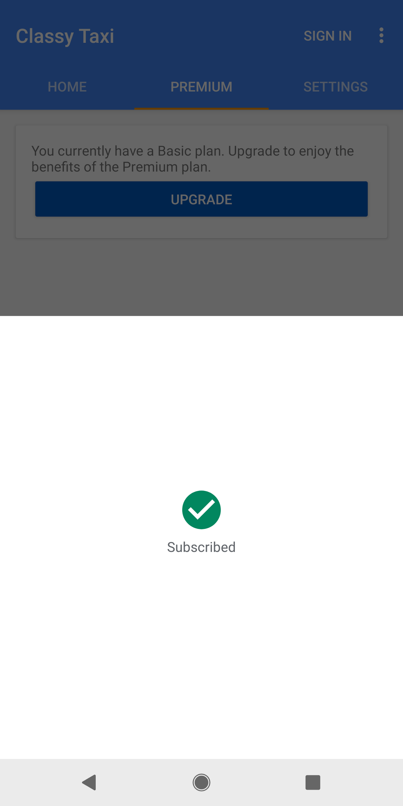 그림 1. Google Play 구매 화면에 구매할 수 있는 정기 결제가 표시됨 이후 onPrucasesUpdate를 호출하여 사용자의 응답상태에 따라 로직을 처리하고 구매 성공 시 Google Play 구매 성공 화면이 생성됩니다.