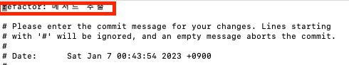 위의 커밋 메시지를 수정하고 :wq를 통해 저장해 줍니다.