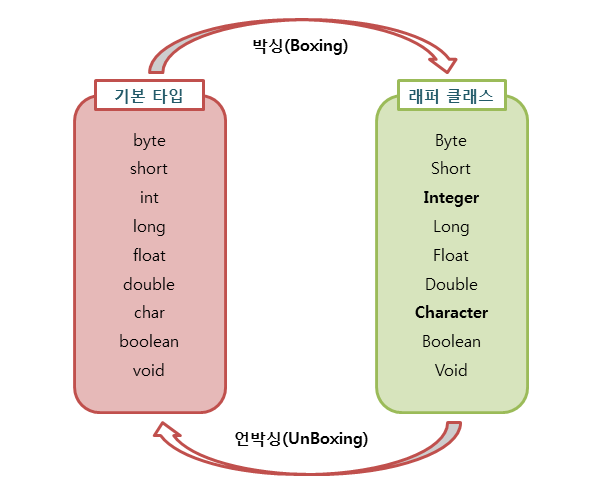 위의 그림과 같이 기본 타입의 데이터를 래퍼 클래스의 인스턴스로 변환하는 과정(객체화하는 과정)을 박싱이라고 합니다.