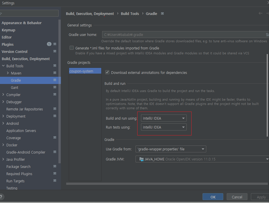 which significantly speeds up the building process. Yet, keep in mind that the IntelliJ IDEA compiler does not support some parts of the Gradle project build processing and might cause problems in building your project correctly.Intellij IDEA 공식문서의 내용 중 일부입니다.