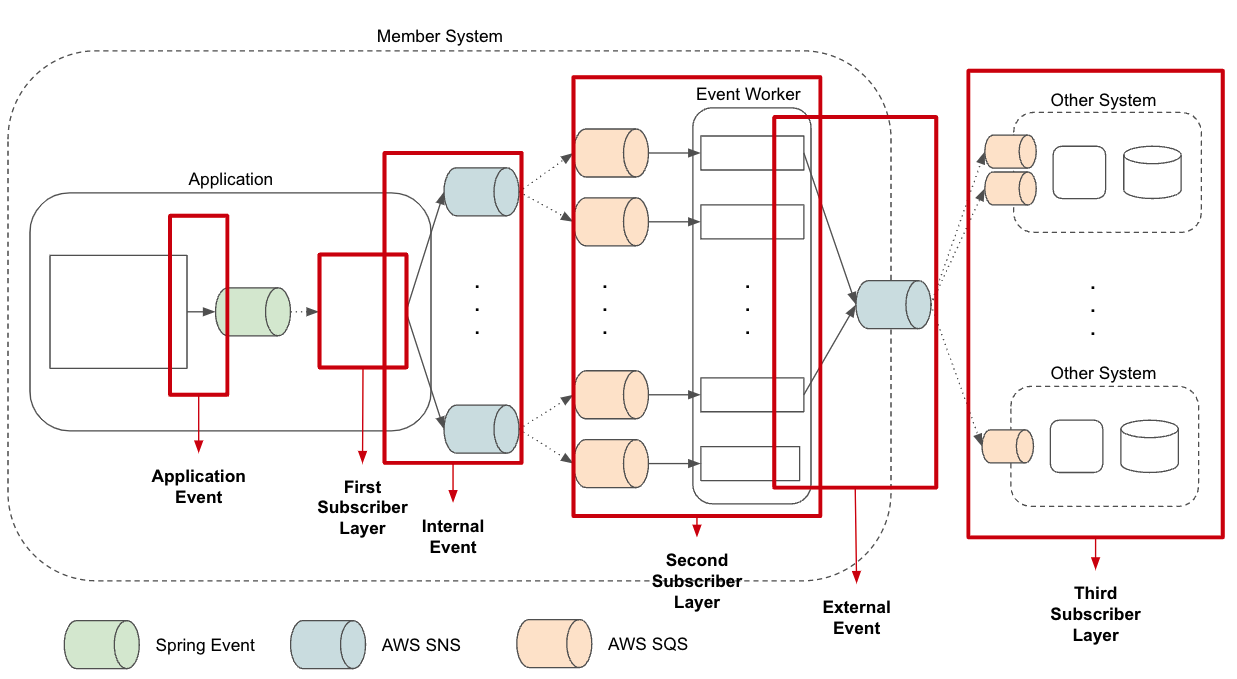 - 첫 번째 계층의 SNS 발행 구독자는 AFTER_COMMIT 옵션으로 도메인의 트랜잭션이 정상 처리되었을 때 SNS로 내부 이벤트를 발행하게 됩니다.