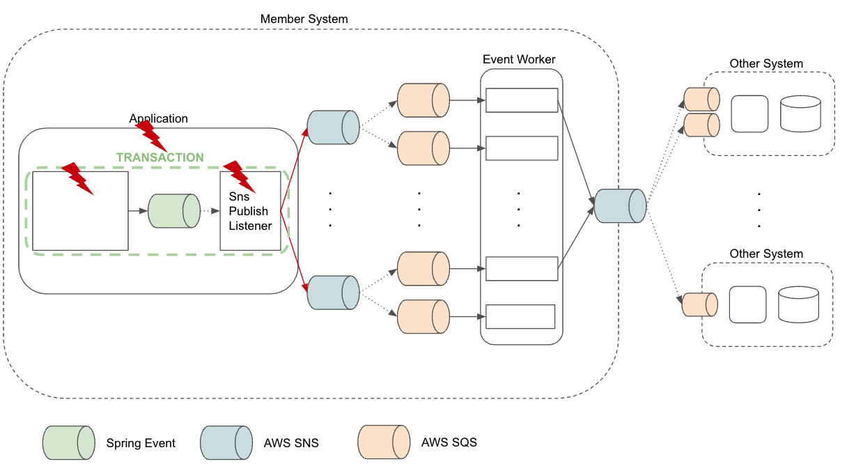 하지만 애플리케이션-SNS 구간에서는 HTTP 통신을 사용하므로 이벤트를 발행하는 과정에 문제가 발생할 수 있습니다.