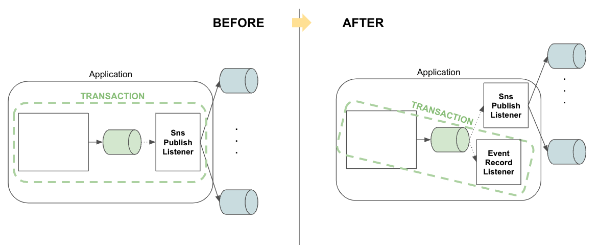 그러나 트랜잭션 외부에서 처리되기 때문에 이벤트 발행에 대한 보장이 사라지게 되었습니다. 애플리케이션-SNS 구간에서는 HTTP 통신을 사용하므로 네트워크 구간에서는 다양한 문제로 충분히 실패가 발생할 수 있습니다.