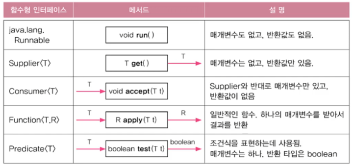 Supplier<Integer> s = () -> (int) (Math.random()* 100) + 1; //입력값 필요없고 반환값 필요 Consumer<Integer> c = i -> System.out.print(i + " , "); //입력값 i가 필요하고 반환값 필요없음 Predicate<Integer> p = i -> i%2==0; //boolean 값 //Predicate<Integer, Boolean>이라고 사용해야 하지만 반환타입은 항상 Boolean이여 사용하지 않습니다. Function<Integer, Integer> f = i -> i/10*10; //입력값 i 가 필요하고 반환값 필요 List<Integer> list = new ArrayList<>(); makeRandomList(s, list); //list를 랜덤으로 생성 System.out.println(list); static <T> void makeRandomList(Supplier<T> s, List<T> list){ for(int i=0;i<10;i++){ list.add(s.get()); } }Supplier <T>와 List <T> 타입을 인자로 받고 list에 랜덤 값을 추가하는 코드입니다.