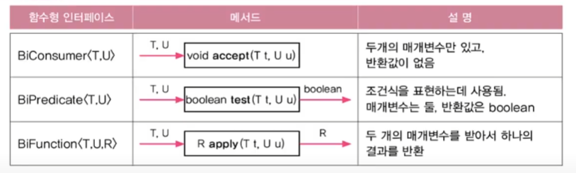 기본이 되는 함수 인터페이스에 둘을 뜻하는 접두사 Bi를 붙여 이름 지어졌습니다.