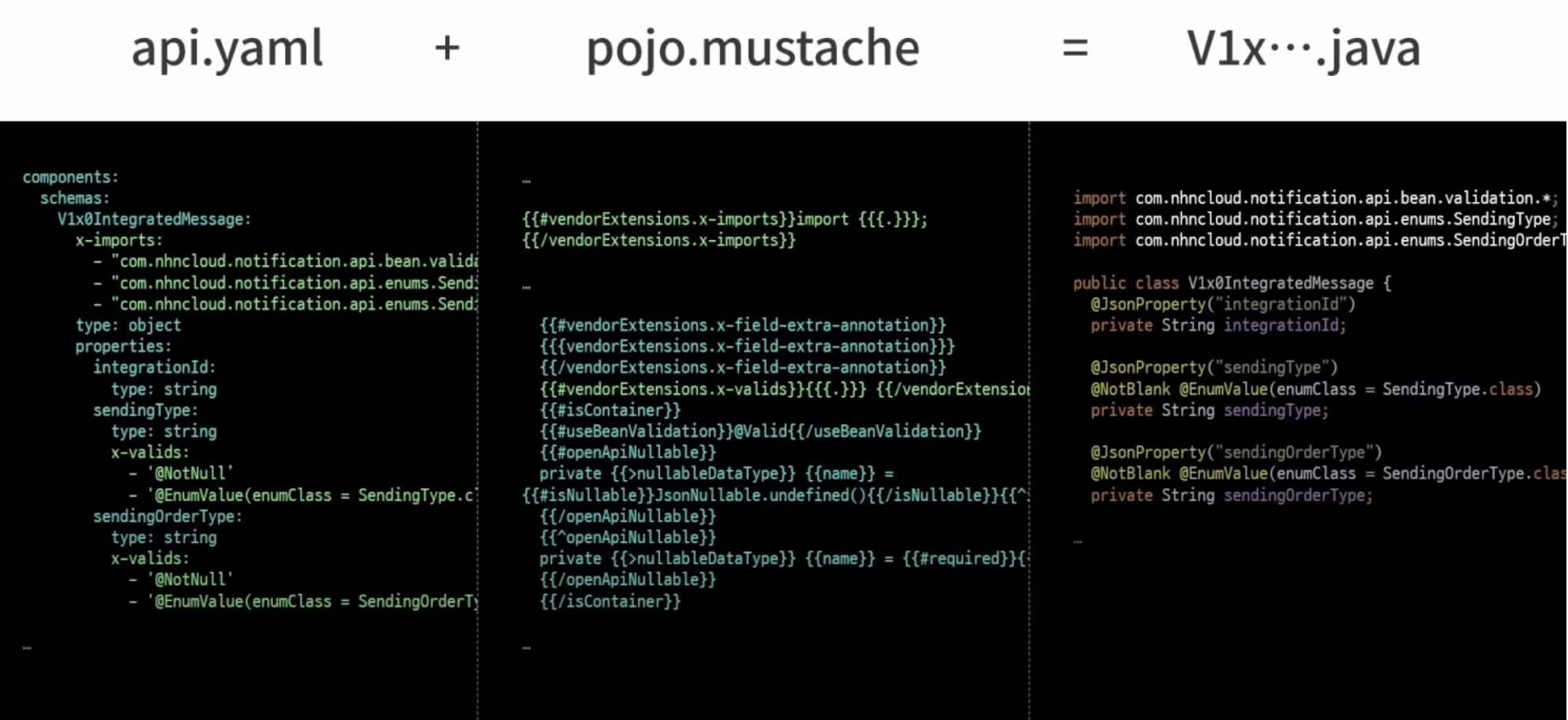 이를 위해서는 OpenAPI Generator를 확장 구현해야 하며 Mustache라는 템플릿언어를 수정하여 확장을 할 수 있었습니다.