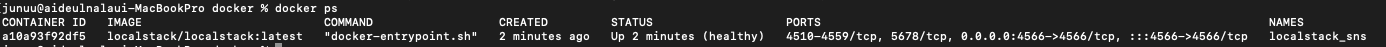 version: '3.4' services: localstack: image: localstack/localstack:latest container_name: localstack_sns_sqs ports: - '4566:4566' environment: - DEFAULT_REGION=ap-northeast-2 - SERVICES=sns,sqs - DEBUG=1 - DATA_DIR=/tmp/localstack/data volumes: - '/var/run/docker.sock:/var/run/docker.sock'우선 sns부터 테스트해보고자 합니다.